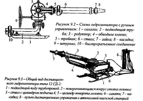 В качестве машины, осуществляемой гидравлический способ выемки угля, используется гидромонитор, с помощью которого формируется диаметр и плотность водяной струи, скорость ее движения и количество подаваемой воды. По величине диаметра регулируемого насадками на выходе из гидромонитора эти струи подразделяются на: