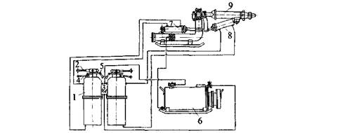 3 и 4-ручки переключения ручного и автоматического режимов; 5 — полумуфта; 6 - насосная станция; 7и 8- цилиндры гидромонитора соответственно поворота и подъема ствола 9