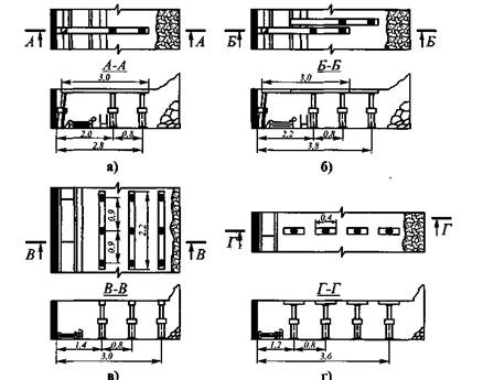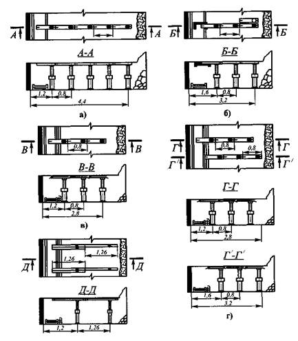 Рисунок 10.23 - Схемы расположения в лаве крепежных рам, состоящих из деревянных верхняков и металлических стоек: а и б- трения; в и г- гидравлических