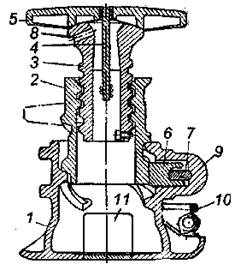 Стойка ОКУ (см. рис. 11.1) состоит из станины 1, основного винта 2, настроечного винта 3, гибкого стержня из отрезка каната 4, насадки (опорной плиты) 5, колодки 6 клина 7, отверстия для размещения воротка при повороте настроечного винта 8, клинового пояса 9, рукояти 10, окна для очистки полости тумбы 11.
