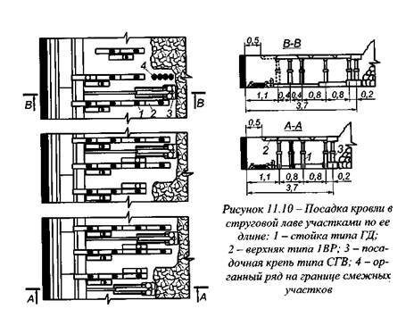 11.1.2 Технологические схемы и рабочие операции при посадке кровли в лавах пологонаклонных пластов
