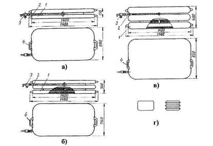 резинокордовые типоразмеров соответственно 6ПМ2 (а), 6ПМЗ (б) и 6ПМ4 (в), их графическое изображение на "Паспорте..." (г): 1 — оболочка;