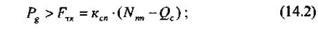 Усилие, развиваемое домкратами на передвижку секции (полусекции) крепи (см. рис. 14.5) Рg, зависит от ее массы Qc, коэффициента сопротивления движению стальной поверхности по породе ксп, а также пассивного Νnn и активного Ναn подпоров. При потере контакта перекрытия с кровлей и образовании между ними зазора ΔZk (см. рис. 14.5, а), для обеспечения перемещения секции крепи при отсутствии вдавливания ее основания в почву сохраняться условие: