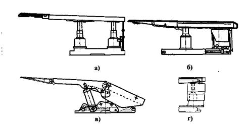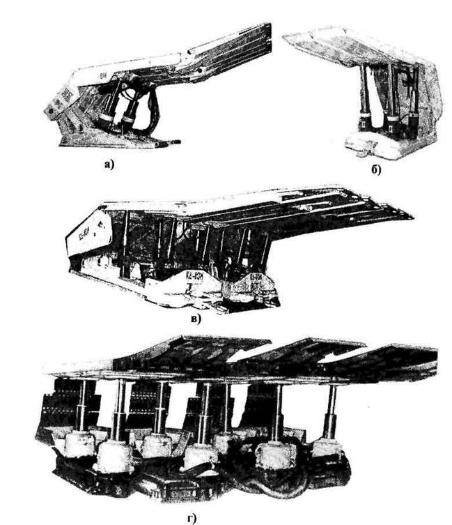 По количеству гидравлических стоек в секции с одинарной или двойной раздвижностями, обеспечивающих распор основания и перекрытия между почвой и кровлей, наибольшее распространение получили дву- и четырехстоечные MK (рис. 14.2), с наклоном стоек в сторону очистного забоя (см. рис. 14.2, б) и четырехстоечные - в противоположные стороны (см. рис. 14.2, г), а также без наклона, перпендикулярно плоскости пласта соответственно рисунки 14.2,а и 14.2, г. Различные схемы размещения стоек в секциях MK определяются особенностями их силового взаимодействия с боковыми породами при соответствующем направлении выемки пласта.