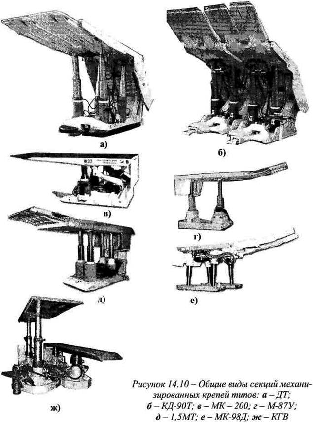 Рисунок 14.11 - Общие виды секций механизированных крепей типов-а -ДМ; б - КД-90; в - КД-80м, г - IMKC