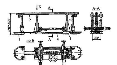Рисунок 16.2- Схема механизированной крепи сопряжения типа КСШ-5: 1 - секции крепи; 2 - верхнее перекрытие; 3 - гидростойки; 4 - гидродомкрат передвижки