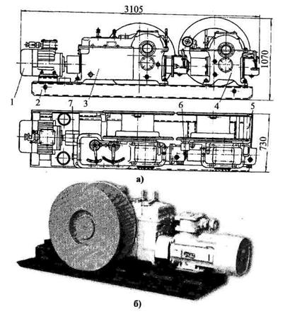 Рисунок 16.8 - Схема лебедок 1ЛГКНМ2Э (а) и общий вид 1ЛГКНМ1Э (б): 1 - электродвигатель; 2 -рама; 3 - редуктор рабочего барабана; 4 - редуктор предохранительного барабана; 5 -роликнаправляющий; 6-тормозное устрой-ство; 7 –упор