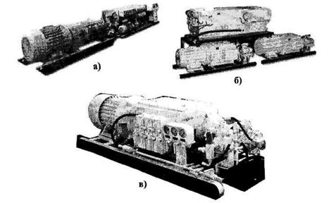Насосные станции (табл. 16.5, рис. 16.9) предназначены для нагнетания рабочей жидкости в гидросистему механизированных крепей, устанавливаются на подошву прилегающей к лаве выработке или находится в составе энергопоезда. Станции состоят из одного или двух агрегатов, подпитанной установки, баков и электродвигателей (число последних зависит от количества агрегатов).