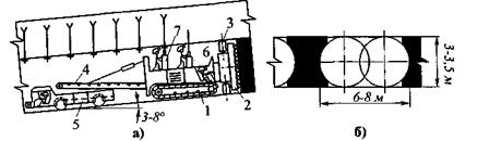 Рисунок 19.12- Схема (в продольном разрезе) выемки угольного пласта механизированным комплексом фирмы "Джой" (а) и форма его очистного забоя по высоте (б)