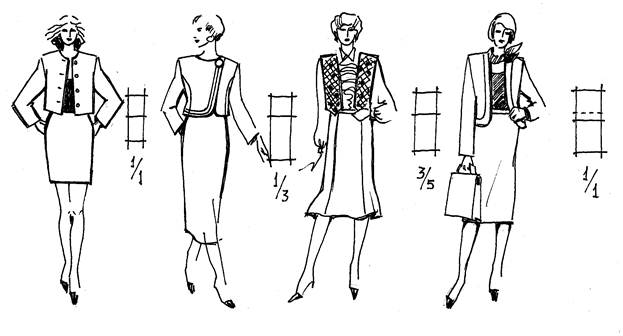 Для фигур невысокого роста, для полных фигур пропорции выбираются таким образом, чтобы центр тяжести силуэта визуально казался выше (рис. 7). Так, для стройной фигуры маленького роста рекомендуется короткий костюм в пропорции 1/1. Особенно эффектен этот костюм, если жакет и юбка одного цвета. На узко сложенных женщинах короткие жакеты-спенсеры контрастируют с нижней частью тела и создают иллюзию длинных ног. Соотношение 3/5 и 1/1, когда юбка достигает середины колена, является удачным вариантом для широкосложенных фигур невысокого роста.