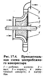 Центробежный многоступенчатый компрессор (нагнетатель) рассчитан на подачу газов давлением до 0,8 - 1 МПа. Принцип его работы (рис. 17.4) следующий. Рабочее колесо 1 с радиально направленными каналами укреплено на валу 2 и вращается с помощью двигателя в корпусе 3. Воздух или газ, поступающий в каналы рабочего колеса, отбрасывается центробежной силой к периферии и попадает в лопаточный аппарат 4, лопатки которого образуют расширяющиеся каналы. В этих каналах вследствие уменьшения скорости воздуха (газа) повышается его давление. Далее сжатый воздух через напорный патрубок 5 поступает в нагнетательный трубопровод. По описанному принципу работают и центробежные вентиляторы, приводимые электродвигателями и создающие избыточное давление до 12 кПа.