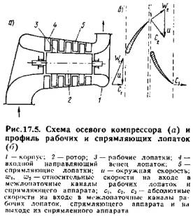 Каждый ряд рабочих лопаток в совокупности со следующим за ним спрямляющим аппаратом составляет одну ступень повышения давления. Число ступеней может доходить до 15—20. Профиль рабочих и спрямляющих лопаток выбирают так, что при прохождении через межлопаточные каналы рабочих лопаток воздух получает от ротора механическую энергию и скорость его возрастает, а при прохождении через спрямляющий аппарат скорость воздуха уменьшается, вследствие чего возрастает его давление. Это иллюстрируется треугольниками скоростей на рис. 17.5,б.