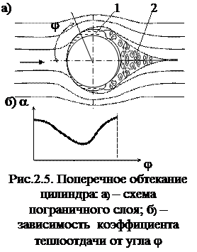 При поперечном обтекании цилиндрических поверхностей (рис. 2.5,а) набегающий поток огибает поверхность цилиндра и создает на его поверхности гидравлический пограничный слой 1. Толщина этого слоя минимальна в лобовой части. По мере ухода от лобовой части она растет и достигает максимальных значений при j=95¼105°. В этом месте наблюдается срыв пограничного слоя, и в кормовой части возникает турбулентная зона 2, образующая кормовой след. Толщина гидравлического ламинарного пограничного слоя в кормовой части уменьшается. В соответствии с изменениями толщины гидравлического пограничного слоя изменяются и локальные значения коэффициента теплоотдачи (рис. 2.5,б). При ламинарном набегающем потоке коэффициент теплоотдачи ниже, чем в лобовой части, а при движении теплоносителя в турбулентном режиме соотношение между локальными значениями в лобовой и кормовой части меняется на противоположное. Средние значения коэффициента теплоотдачи определяются из критериального уравнения.