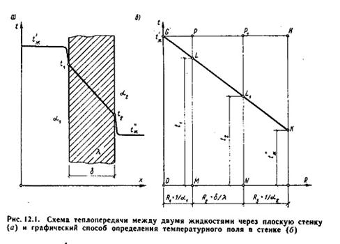 R0 = 1/К = (1/a1 + d/l + 1/a2) – полное термическое сопротивление теплопередачи через однослойную плоскую стенку. (12.6)