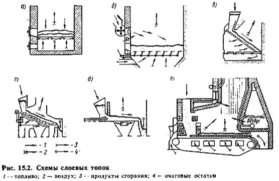 2) с неподвижной колосниковой решеткой и перемещением топлива по решетке (рис.15.2 в, г, д);