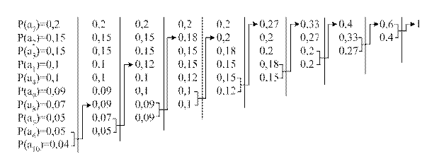 Буквы алфавита сообщений выписывают в основной столбец таблицы кодирования в порядке убывания вероятностей. Две последние буквы объединяют в одну вспомогательную букву, которой приписывают суммарную вероятность. Вероятность букв, не участвовавших в объединении, и полученная суммарная вероятность слова располагаются в порядке убывания вероятностей в дополнительном столбце, а две последние объединяют. Процесс продолжается до тех пор, пока не получим единственную вспомогательную букву с вероятностью, равной единице.