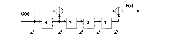 Схема кодера с вынесенными сумматорами приведена на рисунке. На вход схемы поступает многочленQ(x), начиная с коэффициентов высших порядков.