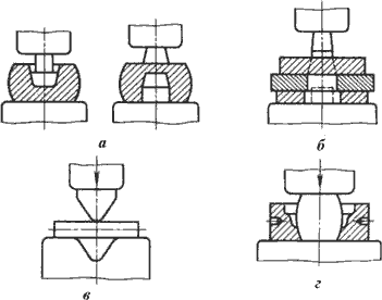 Рис.12.4. Схемы прошивки (а,б), гибки (в), штамповки в подкладных штампах (г)
