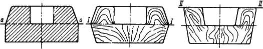 В некоторых случаях положение плоскости разъема определяется макроструктурой металла. Например, при штамповке шестерен плоскость разъема должна быть перпендикулярна к оси детали. В этом случае макроструктура получается одинаковой у всех зубьев шестерни и обеспечивает их высокую прочность. На рис. 13.4 показан выбор положения разъема штампа по условиям работы детали. Если деталь работает на срез по линии а – а, то волокна металла должны располагаться перпендикулярно к линии среза (положение II – II). Положение плоскости разъема I – I в данном случае нежелательно.
