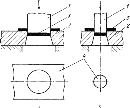 укладывают на плоскость матрицы 3. Пуансон 1 надавливает на заготовку и она, смещаясь в отверстие матрицы, образует стенки вытянутой детали диаметром