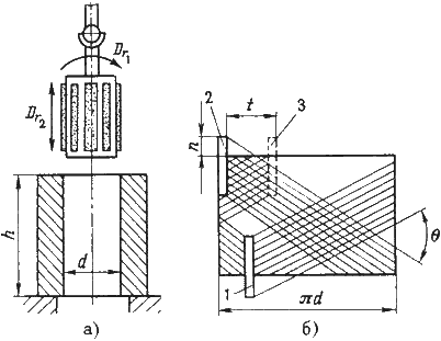 Поверхность неподвижной заготовки обрабатывается мелко-зернистыми абразивными брусками, закрепленными в хонинговальной головке (хоне). Бруски вращаются и одновременно перемещаются возвратно- поступательно вдоль оси обрабатываемого отверстия (рис. 20.3.а). Соотношение скоростей движений составляет 1,5…10, и определяет условия резания.