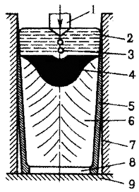 Переплаву подвергается выплавленный в дуговой печи и прокатанный на пруток металл. Источником теплоты является шлаковая ванна, нагреваемая электрическим током. Электрический ток подводится к переплавляемому электроду 1, погруженному в шлаковую ванну 2, и к поддону 9, установленному в водоохлаждаемом кристаллизаторе 7, в котором находится затравка 8. Выделяющаяся теплота нагревает ванну 2 до температуры свыше 1700?C и вызывает оплавление конца электрода. Капли жидкого металла 3 проходят через шлак и образуют под шлаковым слоем металлическую ванну 4. Перенос капель металла через основной шлак способствует удалению из металла серы, неметаллических включений и газов. Металлическая ванна пополняется путём расплавления электрода, и под воздействием кристаллизатора она постепенно формируется в слиток 6. Содержание кислорода уменьшается в 1,5…2 раза, серы в 2…3 раза. Слиток отличается плотностью, однородностью, хорошим качеством поверхности, Высокими механическими и эксплуатационными свойствами. Слитки получают круглого, квадратного и прямоугольного сечения, массой до 110 тонн.