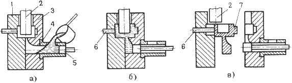 На машинах с горизонтальной холодной камерой прессования (рис. 7.1) расплавленный металл заливают в камеру прессования 4 (рис. 7.1.а). Затем металл плунжером 5, под давлением 40…100 МПа, подается в полость пресс-формы (рис.7.1.б), состоящей из неподвижной 3 и подвижной 1 полуформ. Внутреннюю полость в отливке получают стержнем 2. После затвердевания отливки пресс-форма раскрывается, стержень 2 извлекается (рис. 7.1.в) и отливка 7 выталкивателями 6 удаляется из рабочей полости пресс-формы.