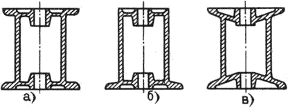 Корпусная деталь, показанная на рис. 8.4. а имеет перегородки, которые затрудняют процесс усадки, в результате чего возникают значительные литейные напряжения. Конструкция, представленная на рис. 8.4.б, обеспечивает свободную усадку. Придание перегородкам конической формы (рис. 8.4. в) также снижает усадочные напряжения.