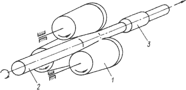 Поперечная прокатка периодических профилей характеризуется тем, что заготовка и готовый профиль представляют собой тела вращения. Схема прокатки на трехвалковом стане представлена на рис.11.3.