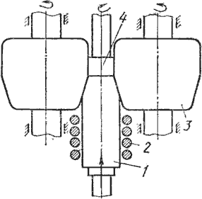 Поперечной прокаткой накатывают зубья шестерен между двумя вращающимися валками. Возможны два способа обработки зубьев: с осевой подачей обрабатываемой заготовки (прутковая прокатка) и прокатка с радиальной подачей валков (штучная прокатка). Прутковая прокатка шестерен (рис.11.4) применяется для обработки прямозубых и косозубых шестерен с небольшими модулями (до 6 мм) и диаметром до 200 мм. Образование зубьев при прокатке осуществляется перемещением нагретой в кольцевом индукторе 2 заготовки 1 между двумя вращающимися зубчатыми валками 3, модуль которых равен модулю прокатываемой шестерни 4.