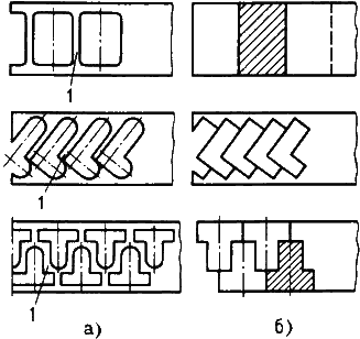 Рис.15.7. Примеры раскроя материала с перемычками (а) и без перемычек (б)