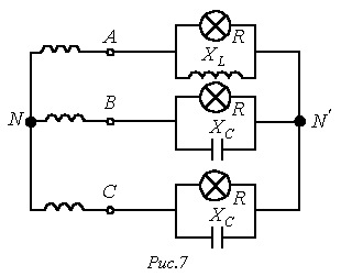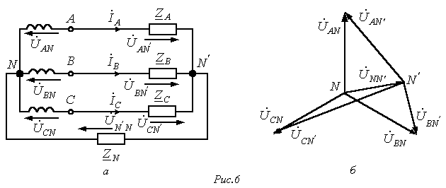 Рассмотрим трехфазную цепь на рис. 6,а. При симметричном питании и несимметричной нагрузке