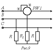 Если режим работы цепи симметричный, то для определения суммарной активной мощности достаточно ограничиться одним ваттметром (любым), включаемым по схеме на рис. 8. Тогда, например, при включении прибора в фазу А,