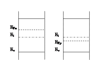 В дырочном полупроводнике концентрация дырок в основном обусловлена переходом электронов с энергетических уровней валентной зоны на энергетический уровень акцепторов. При этом уровень Ферми должен быть расположен ниже середины запрещенной зоны (рис.3.2,б), график р(Е) сдвинут вниз, ординаты графика Fр(Е) должны возрасти, а ординаты графика Fn (Е) уменьшиться. Следовательно,