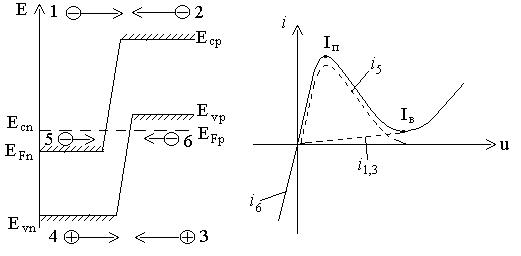 Туннельные переходы не связаны с преодолением энергетического барьера. Для их осуществления необходимо, чтобы занятым энергетическим уровням в одной зоне противостояли свободные энергетические уровни в другой. Если сделать допущение, что все энергетические уровни, расположенные ниже уровня Ферми, заняты электронами, а уровни, расположенные выше уровня Ферми, свободны, то при отсутствии внешнего напряжения туннельные переходы не происходят. Если к переходу приложить прямое напряжение, то правая часть энергетической диаграммы сместится вниз относительно левой, и занятым уровням зоны проводимости будут противостоять свободные уровни валентной зоны, в результате чего создадутся условия для туннельных переходов из n- области в p- область. По мере увеличения прямого напряжения будет возрастать поток 5 и, соответственно, прямой туннельный ток. Так будет продолжаться до тех пор, пока потолок валентной зоны Evp дырочного полупроводника не совпадет с уровнем Ферми электронного полупроводника (Ev p = EFn). При этом поток 5 будет максимальным. Дальнейшее увеличение прямого напряжения будет смещать уровень Evp ниже уровня EFn. При этом ширина области перекрытия зон, в пределах которой происходят туннельные переходы, будет уменьшаться. Поэтому будет уменьшаться поток 5 и прямой туннельный ток. Когда уровень Evp окажется напротив уровня Ecn, туннельные переходы прекратятся. Наряду с туннельными переходами в структуре существуют обычные переходы через потенциальный барьер. По мере роста прямого напряжения барьер снижается, и потоки 1 и 3 возрастают. Прямой ток создается суммой потоков 1, 3 и 5, поэтому в области прямых напряжений вольтамперная характеристика имеет вид, показанный на рис. 10.1,б. На ней имеются пик и впадина. Чем больше концентрация примесей, тем больше отношение тока пика IП к току впадины IВ. Практически это отношение лежит в пределах от 5 до 10. При подаче на p-n- переход обратного напряжения энергетический барьер в переходе возрастает, правая часть диаграммы сдвигается вверх относительно левой, и возникают обратные туннельные переходы (поток 6) с энергетических уровней валентной зоны на свободные уровни зоны проводимости, что ведет к возрастанию обратного тока.