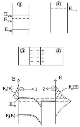 В этом случае снижается барьер qФ и возрастают потоки 1 и 2. При подаче прямого напряжения уменьшается барьер qФ и возрастает поток 1, высота барьера qY сохраняется неизменной, следовательно, увеличивается прямой ток. При подаче обратного напряжения барьер qФ увеличивается, поток 1 уменьшается и возрастает обратный ток, создаваемый разностью потоков 1 и 2. Следовательно, такой контакт одинаково хорошо пропускает ток в прямом и обратном направлениях, то есть является невыпрямляющим. Чем больше концентрация примеси в n+-области, тем меньше барьер qФ и соответственно меньше сопротивление контакта. Подобного рода контакты используют во всех полупроводниковых приборах для создания внешних выводов от n-областей приборов.