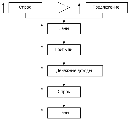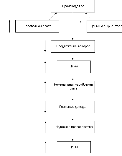Сочетание инфляции спроса и инфляции издержек образует инфляционную спираль ”цены–заработная плата”. В условиях инфляции спроса экономические агенты постепенно корректируют свое поведение: ставки номинальной заработной платы повышаются в новых трудовых соглашениях в соответствии с возросшими инфляционными ожиданиями. Повышение ставок номинальной заработной платы вызывает рост средних издержек производства, что является основой для развертывания инфляции издержек.