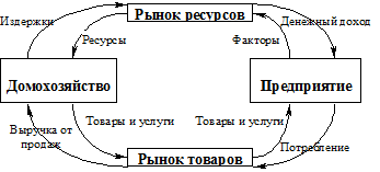 Предприятия, покупая ресурсы у населения, действует как покупатель, а реализуя готовый товар, как продавец. Таким образом, домохозяйства и предприятия связаны двумя рынками: ресурсов и товаров. Навстречу потоку факторов производства, товаров и услуг, движущемуся на схеме против часовой стрелки, движутся деньги (доходы от факторов производства, потребительские расходы, предпринимательские доходы и затраты на ресурсы).