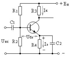 Для работы усилительного каскада с минимальными искажениями сигнала необходимо задать определенный режим работы транзистора, так называемый ток покоя транзистора I0. Для этого, на базу транзистора подается напряжение смещения Uбэ с делителя напряжения R1R2, (чтобы обеспечить некоторый ток покоя базы I0).