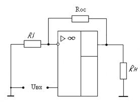 Знак (–) указывает на инвертирование фазы входного сигнала. При этом, для неинвертирующего ОУ, напряжение обратной связи, снимаемого с делителя R1 Rос пропорционально выходному напряжению