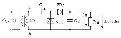 Когда потенциал в точке В положительный, а в точке А отрицательный, диод VD1 открыт, а VD2 закрыт. В этот момент С1 заряжается через диод VD1 до амплитудного значения напряжения U2m. В следующий полупериод диод VD1 закрыт, а VD2 открыт. Конденсатор С2 при этом начинает заряжаться через диод VD2 до напряжения равного сумме напряжений вторичной обмотки трансформатора U2m и напряжения ранее заряженного конденсатора С1. Следовательно, напряжение на резисторе Rн будет равно удвоенному значению напряжения U2m.