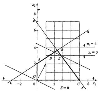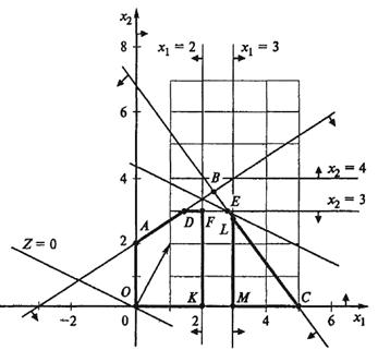 Из рис. 2 видно, что ни одна целочисленная точка исходной ОДР не потеряна. ОДР задачи № 2 является многоугольник OADEC. В точке Е с координатами