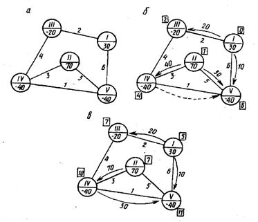 Описанную картосхему будем называть транспортной сетью. Пункты расположения поставщиков и потребителей будем изображать кружками и называть вершинами (узлами) сети, запасы груза будем записывать в кружках положительными, а потребности — отрицательными числами. Дороги, связывающие пункты расположения и потребления груза и другие пункты, будем изображать линиями и называть ребрами (дугами, звеньями) сети. При изображении транспортной сети реальный масштаб не соблюдается. На сети могут быть изображены вершины, в которых нет ни поставщиков, ни потребителей. Наличие таких вершин не повлияет на способ решения, если считать, что запасы (потребности) груза в них равны нулю.