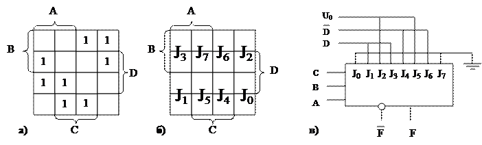 Метод использования универсальной логической схемы для функции трех переменных может быть распространен на реализацию функций четырех и более переменных. Для реализации функции четырех переменных удобнее использовать восьмивходовой мультиплексор. Покажем это на примере.
