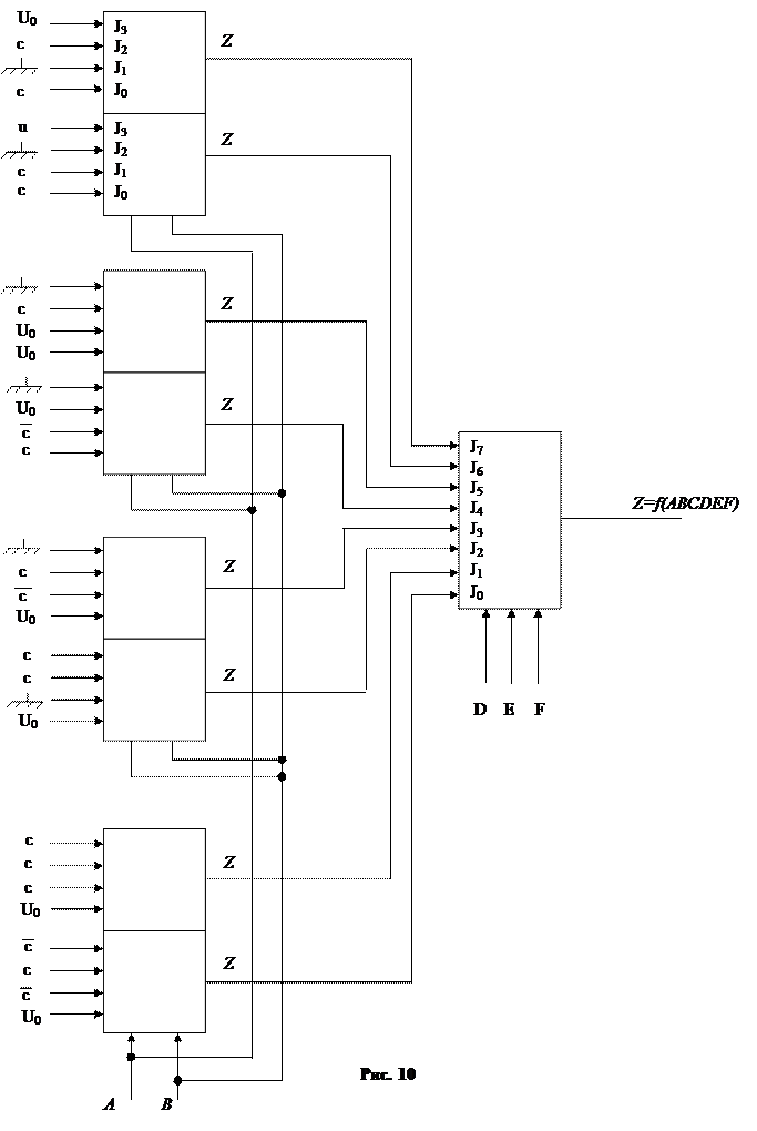 г) подают эти входные сигналы первого уровня на восьмивходовой мультиплексор, который управляется комбинациями сигналов D,E,F, поступающими на шины выборки.