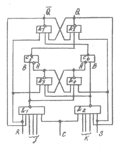 переключают только вспомогательный триггер S. На основе триггера J-K можно, применяя соответствующую коммутацию или используя дополнительные схемы, получить триггеры, выполняющие функции триггеров R-S, D и Т.