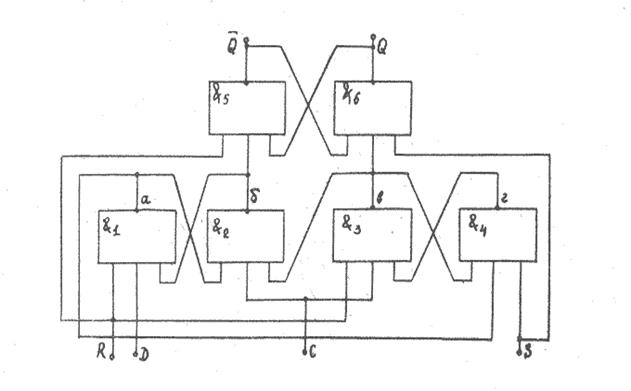 Схема триггера (рис3.3) реализована на элементах И—НЕ; запоминающий элемент образован на И—НЕ5 и И—НЕ6; остальные элементы составляют схему управления триггера с входными сигналами «б» и «в». Функции элементов И—НЕ: