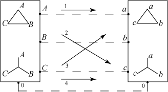 Трёхпроводная линия соединяет начала соответствующих фаз источника и приёмника (A – a, B – b, C – c).