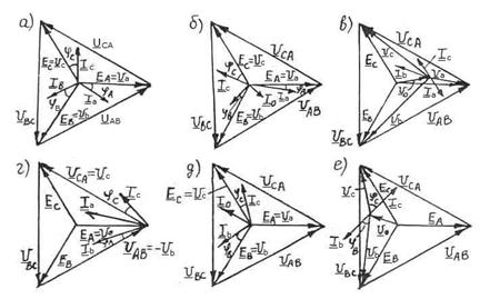 Симметричный режим работы с нулевым проводом (рис.8.9.) аналогичен работе схем без нулевого провода. Векторная диаграмма токов и напряжений имеет вид (рис.).