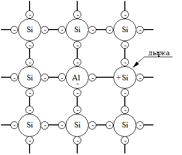 Добавление трёхвалентной примеси (бора B, индия In или алюминия Al) позволяет получить «дырочную» проводимость. Три валентных электрона каждого атома примеси образуют только три ковалентные связи, а для четвёртой ковалентной связи, необходимой для образования устойчивой кристаллической решётки, атом примеси «забирает» электрон у четвёртого атома полупроводника, который превращается в положительно заряженную «дырку» (рис. 1.2). Сам атом примеси становится отрицательно заряженным неподвижным ионом. Привлекая валентные электроны полупроводника, атомы примеси увеличивают концентрацию «дырок» в объёме вещества, поэтому полупроводник, легированный трёхвалентной примесью (акцептором), называется полупроводником p -типа.